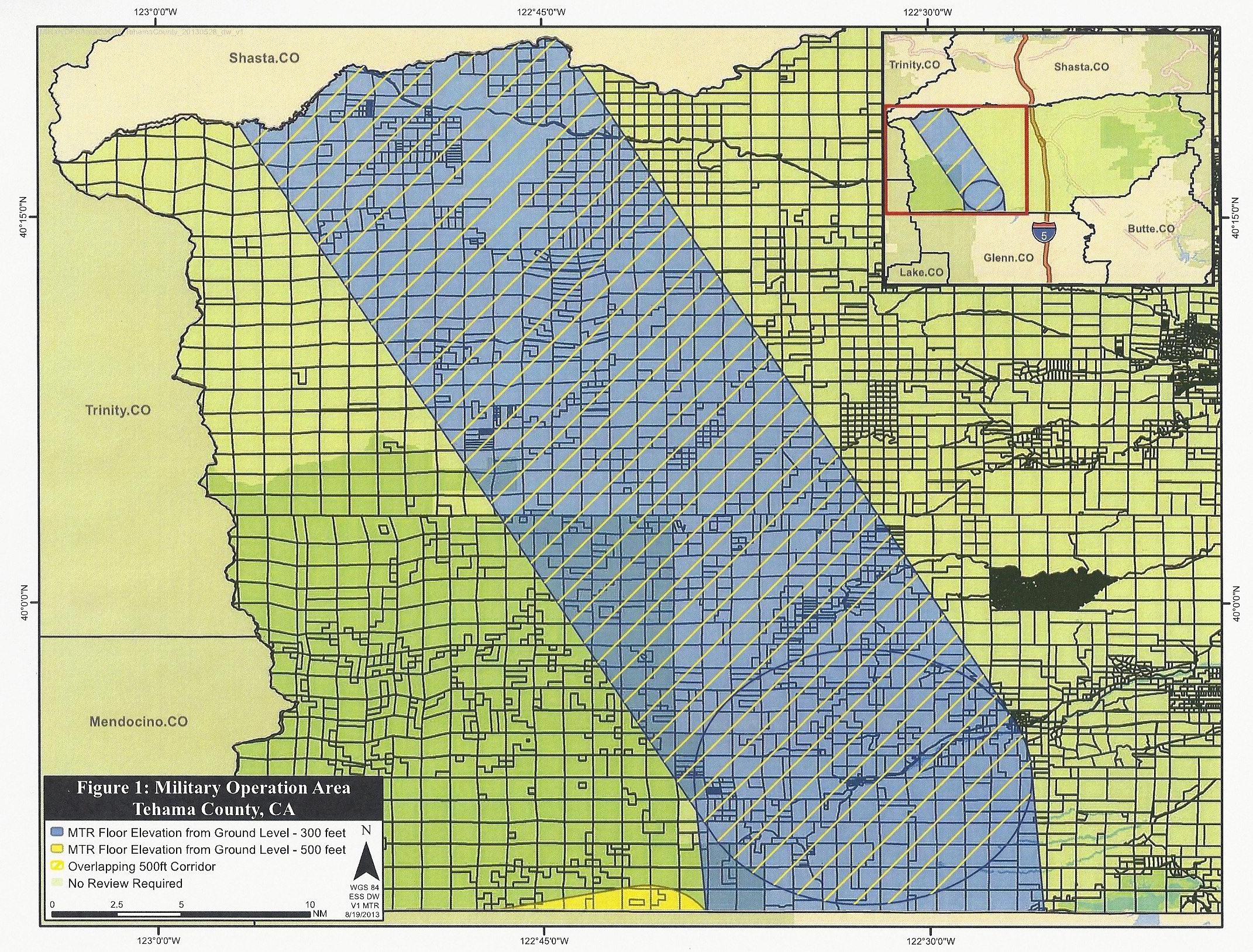 In 2013, the Tehama County Board of Supervisors adopted a Military Operations Area Overlay, as shown above in Figure 1.   For your convenience, Tehama’s Military Operation Area Ordinance and Compatibility GIS Mapping website links are provided below: